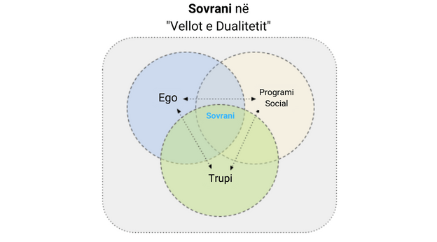 8 Në sferën e dualitetit, ku trup-ego i gjithë njerëzimit përcakton realitetin tonë të përbashkët, asaj që unë i referohem në këtë punim si Programi Social kolektiv, Sovrani banon në mëndje, emocione dhe trup-ego, jo ndryshe nga një astronaut që jeton në një kostum hapësinor.