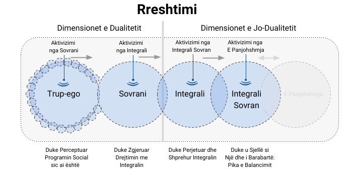 36 Diagrami i mësipërm përfaqëson procesin e shpalosjes pasi ai i përket sferave dualiste dhe përvojës së Sovranit ーpërmes trup-egosーjetëve, niveleve dhe specieve të panumërta. Sovrani është pika e aktivizimit të trup-egos në çdo jetë specifike, megjithatë, trup-ego ka vullnet të lirë për të refuzuar ftesat e tij për zgjerim dhe testim-realiteti. Sovrani është rryma aktivizuese që ndez interesin e trup-egos në këndvështrimin Sovran dhe nga vështrimet në të, trupi-ego mund të riinterpretojë më pas Programin Social personal të tij dhe kolektiv. Në mënyrë të ngjashme, Integrali është ai që aktivizon Sovranin të zgjerohet në një përafrim me energjinë dhe kulturën e tij. Është Integrali Sovran ai që aktivizon Integralin për të përforcuar tërheqjen e tij ndaj Sovranit, në fakt, për ta inkurajuar atë të ndërtojë një kulturë të Integralit Sovran brënda specieve, një Sovran në një kohë, duke ditur se këto harta dhe modele, në cfarëdolloj rezolucioni që ato shfaqenー tërheqin Sovranin e aktivizuar.